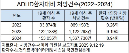 서미화 의원실에서 청소년 ADHD 치료제 처방에 관한 보도자료를 발표했다. 보건빅데이터의 환자수를 가지고 처방횟수를 분석했다. 청소년 ADHD 치료제 처방 335만 건,1년 새 22% 급증했지만 같은 기간 환자수도 증가했다.