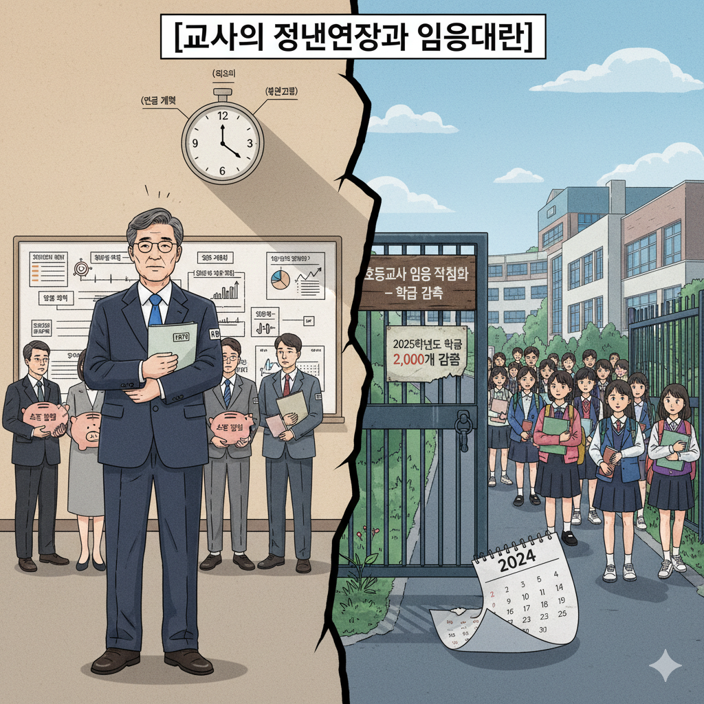 사용자가 제기한 '교사 정년연장과 임용대란' 문제는 두 사안이 결합하며 2031년의 구조적 위기를 2025년의 즉각적 재앙으로 '앞당기는' 시나리오로 전개되고 있다. 2025년의 '수요 붕괴', 2028년의 '정책적 퇴직 지연', 그리고 2031년의 '구조적 퇴직 실종'이라는 3중 충격이 중첩되고 있다.