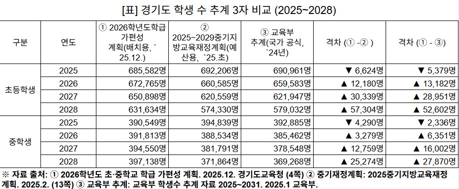2025년 2월 경기도교육청이 발표한 '2025~2029 중기지방교육재정계획'의 학생수 추계과 같은해 12월에 발표한 '2026학년도 초·중학교 학급 가편성 계획'에서의 2028년 학생수 추계는 5.7만명이 차이가 난다. 2026학년도 초·중학교 학급 가편성 계획이 과대계상 되었다. 교육부의 학생추계와 비교해도 5.2만명 차이가 난다. 이정도면 추계라고 할수도 없다.
