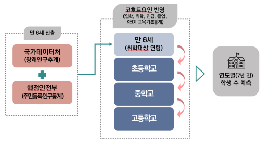– 만 6세 인구에 코호트요인 적용을 통한 초·중·고 학생 수 추계