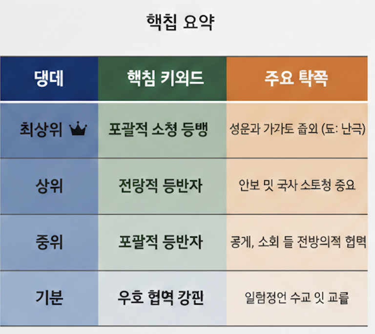 전략적 동반자 관계에서 한 단계 더 나아가 **'포괄적(Comprehensive)'**이라는 단어가 붙습니다. 이는 경제, 안보뿐만 아니라 사회, 문화 등 거의 모든 분야에서 긴밀히 협력함을 의미합니다.